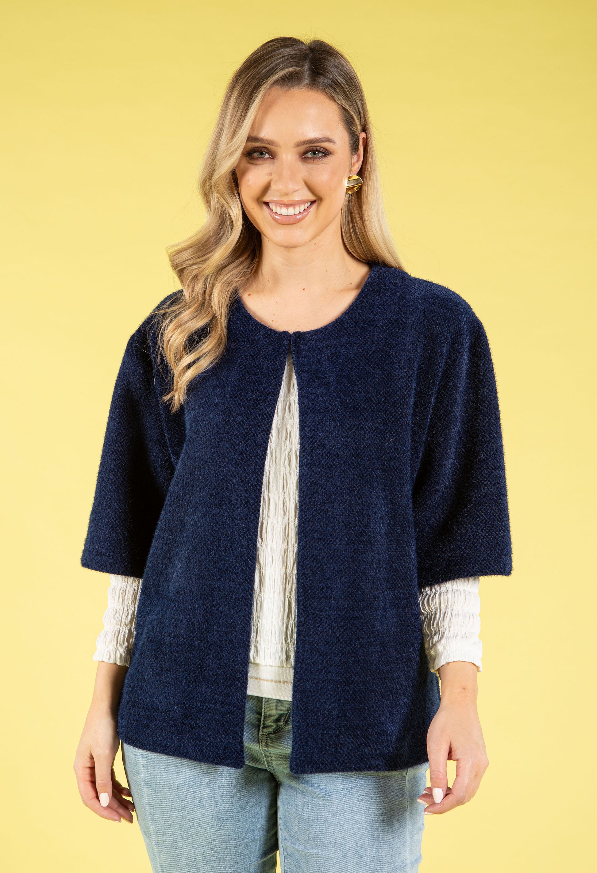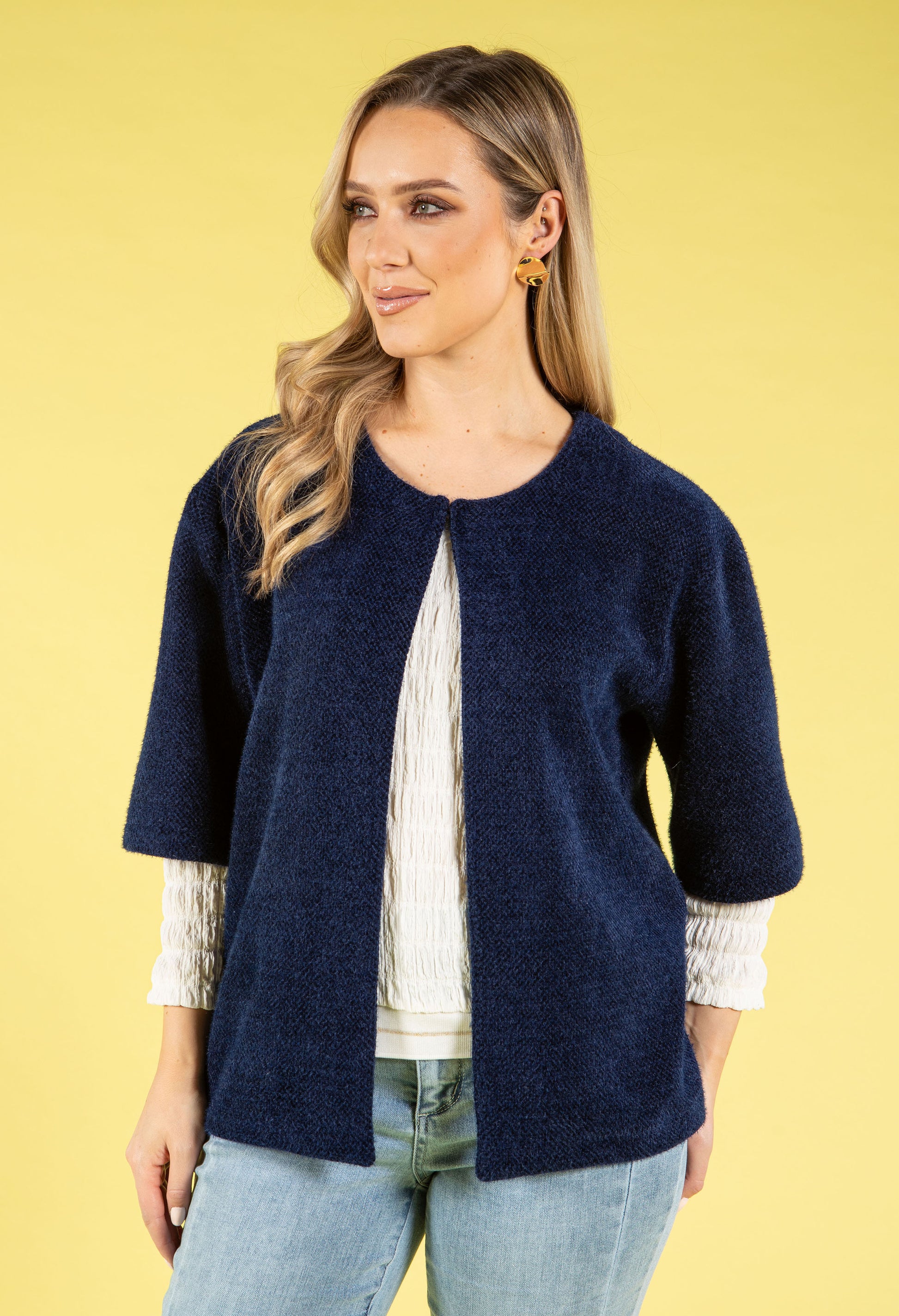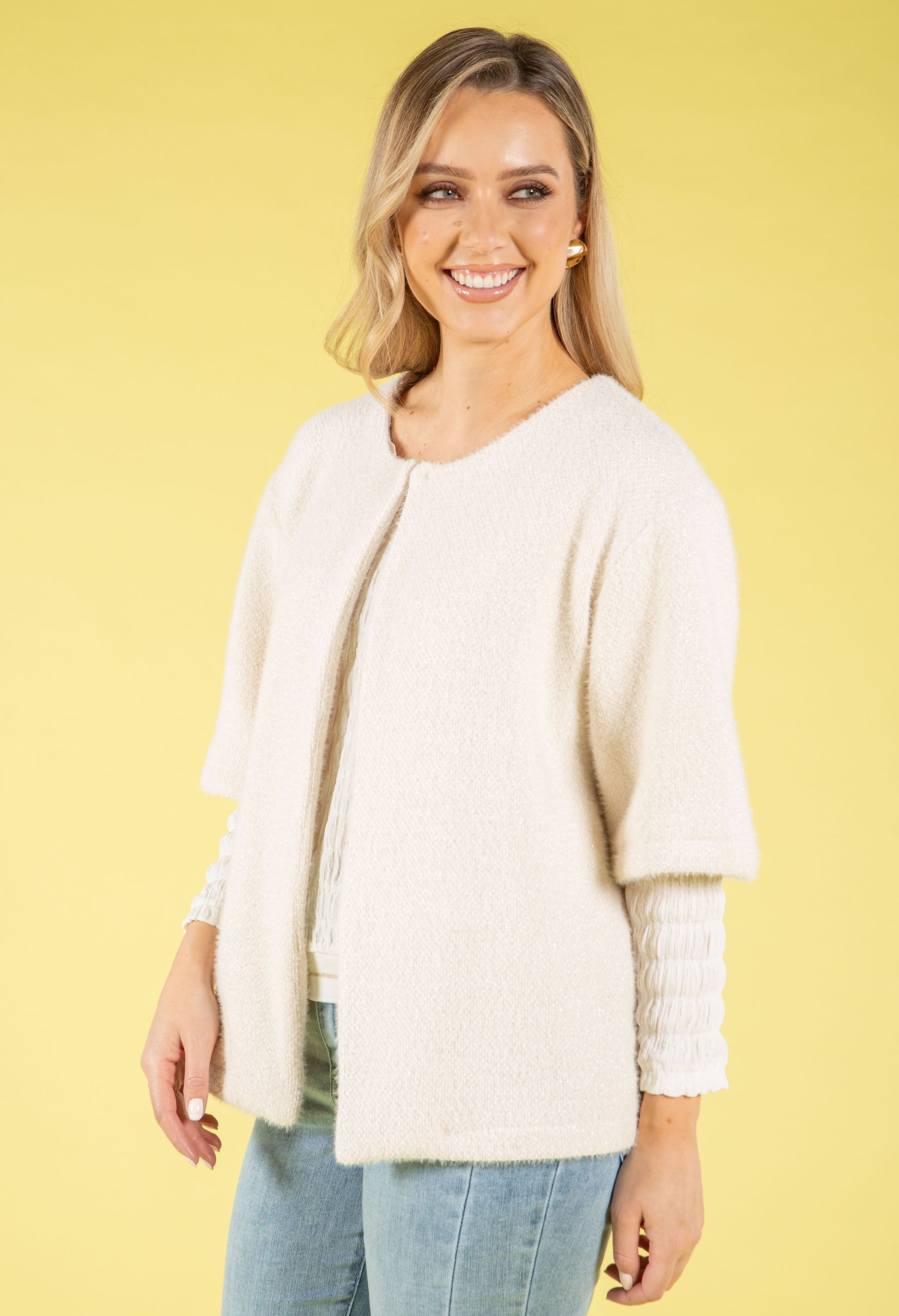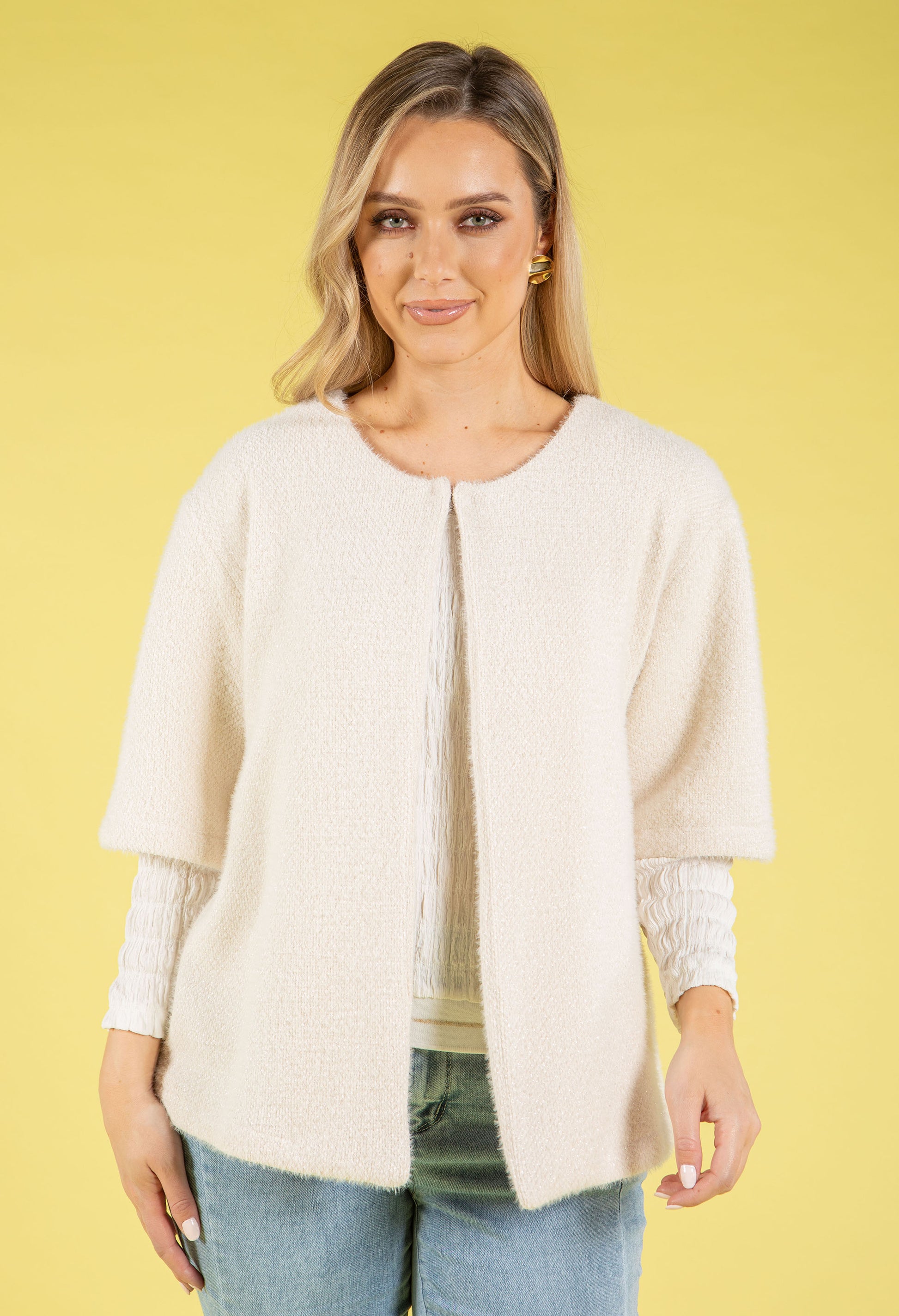 Indulge in luxury with this soft touch coatigan, a versatile piece that seamlessly transitions from day to evening. The relaxed fit drapes beautifully, while the round neckline and three-quarter length sleeves offer classic elegance. A subtle sparkly finish adds just the right amount of glamour, and the secure clasp closure makes layering effortless. Perfect for throwing over any outfit when you need an extra layer of warmth and style.