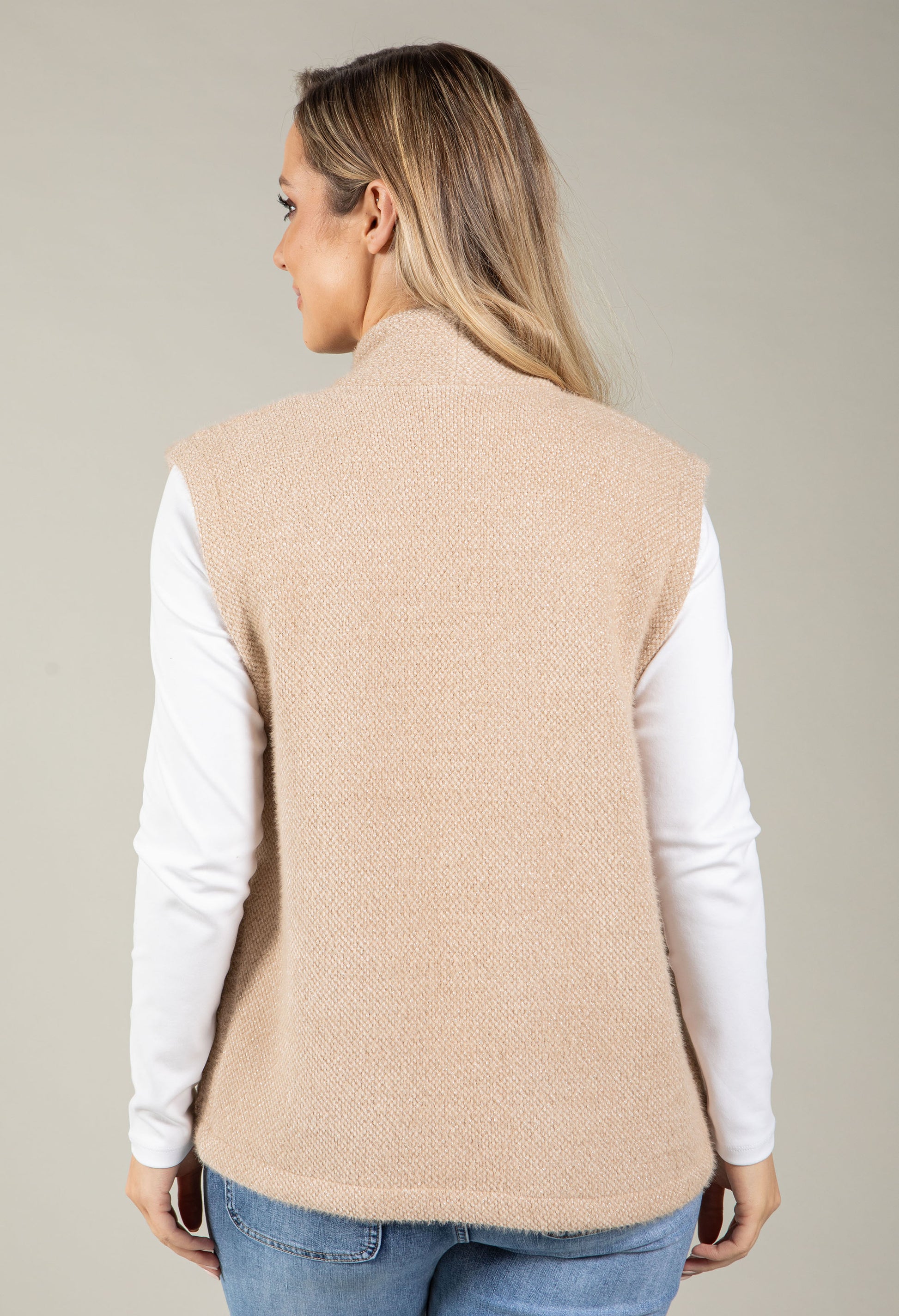 Discover the perfect layering piece with this comfortable longline vest. The sleeveless, open front design works beautifully over your favourite tops and dresses, while the soft touch fabric feels wonderful against your skin. Elegant lurex stitching adds a touch of sparkle and sophistication, and the front patch pockets are both practical and stylish. Whether you're dressing up or keeping it casual, this vest is a go-to choice for effortless, versatile style.