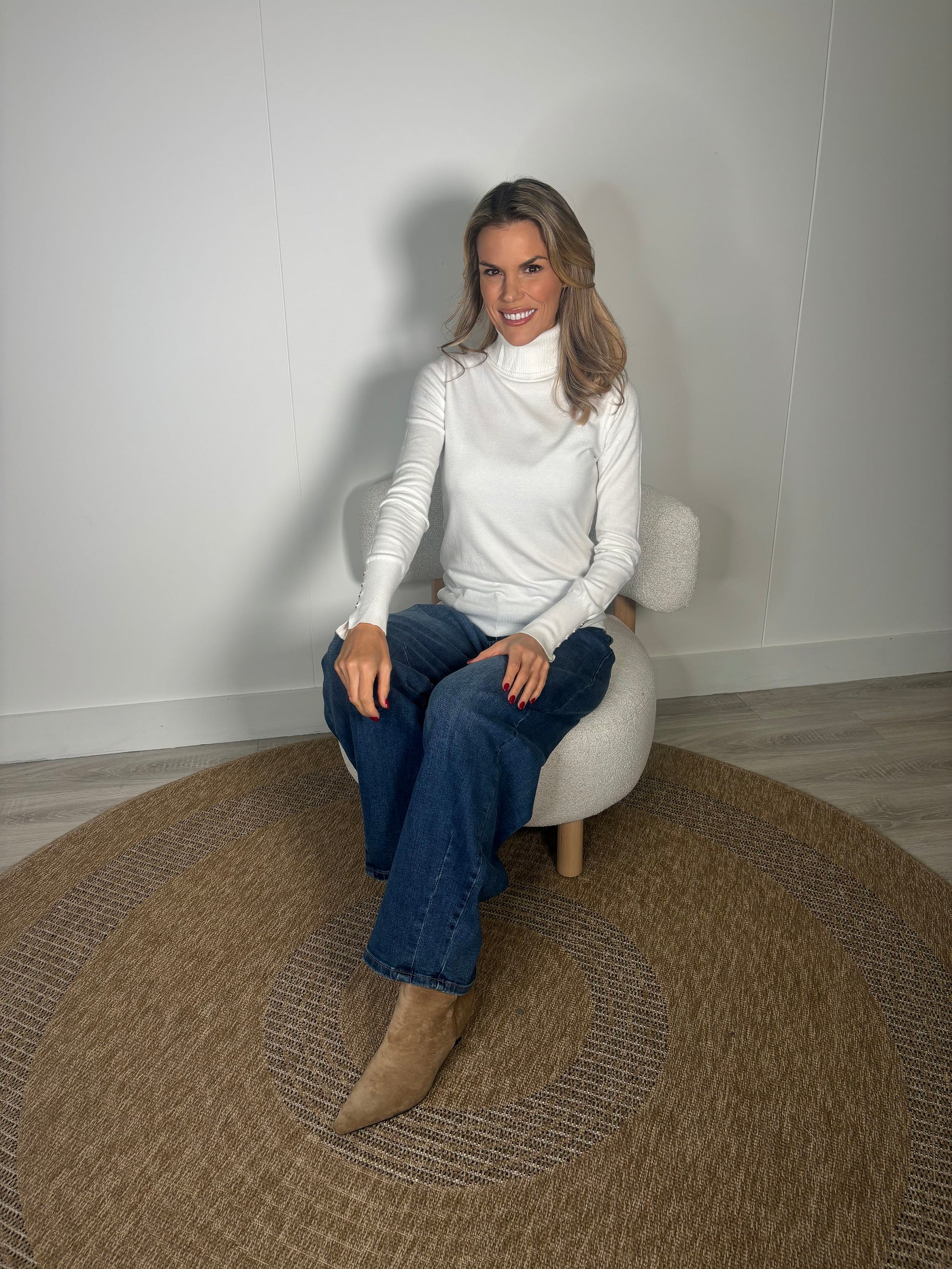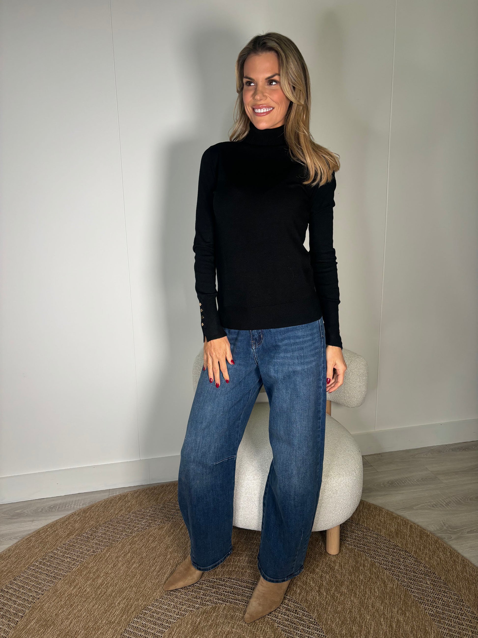 Crafted from a luxuriously soft stretch fabric, this roll neck jumper combines comfort with timeless style. Long sleeves feature ribbed detailing at the cuffs and hem for a polished finish, while the cosy neckline provides extra warmth. Elegant gold button accents add a touch of sophistication to this versatile wardrobe essential.