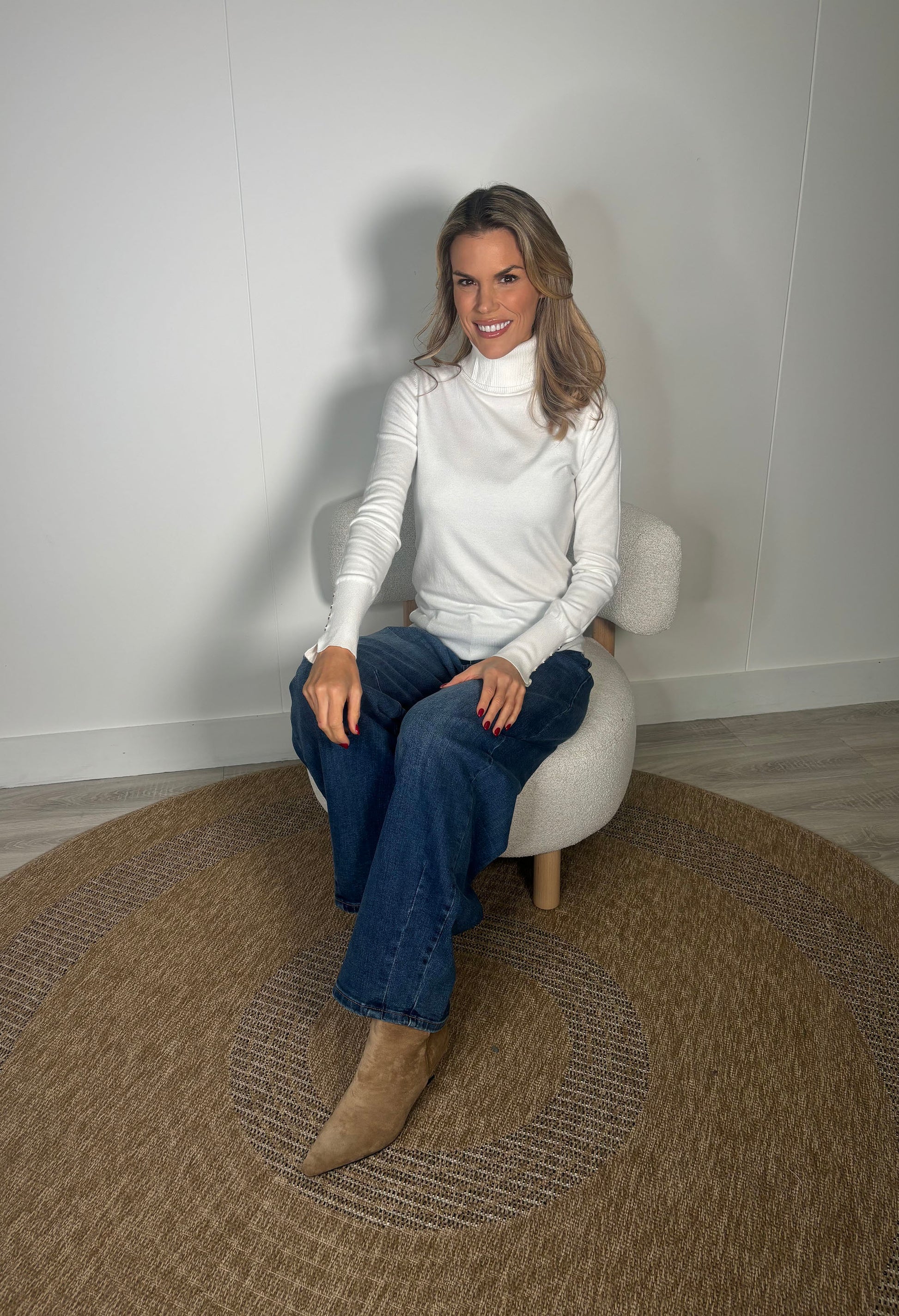 Crafted from a luxuriously soft stretch fabric, this roll neck jumper combines comfort with timeless style. Long sleeves feature ribbed detailing at the cuffs and hem for a polished finish, while the cosy neckline provides extra warmth. Elegant gold button accents add a touch of sophistication to this versatile wardrobe essential.