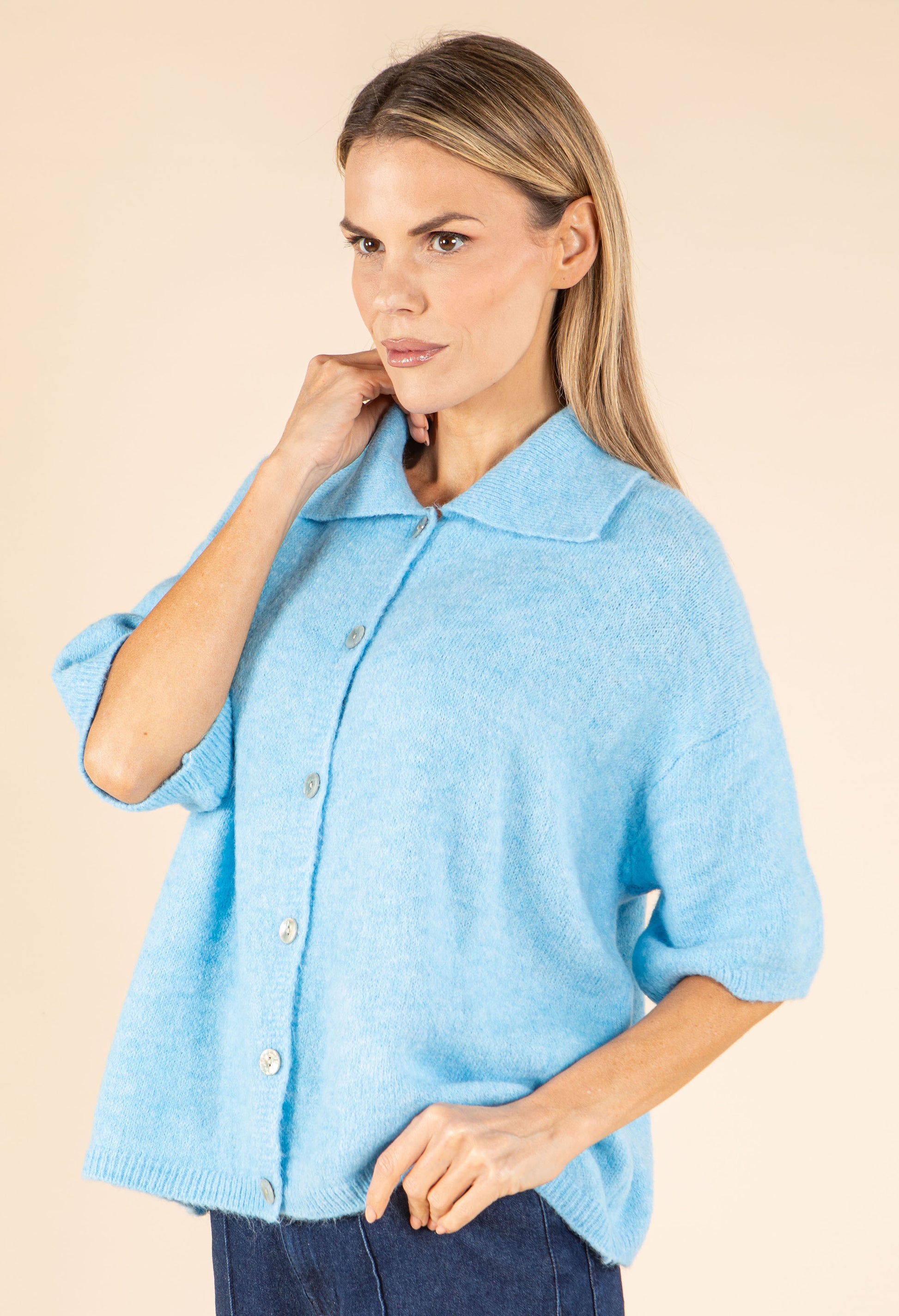 Add a touch of softness and style with this collared cardigan, featuring short batwing sleeves, a button closure, and ribbed cuffs and hem for a comfortable, polished look.