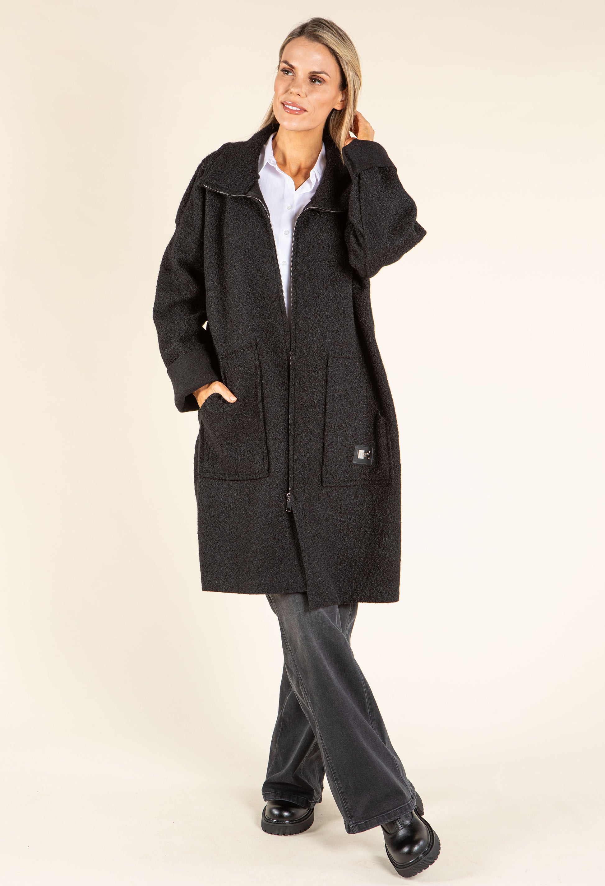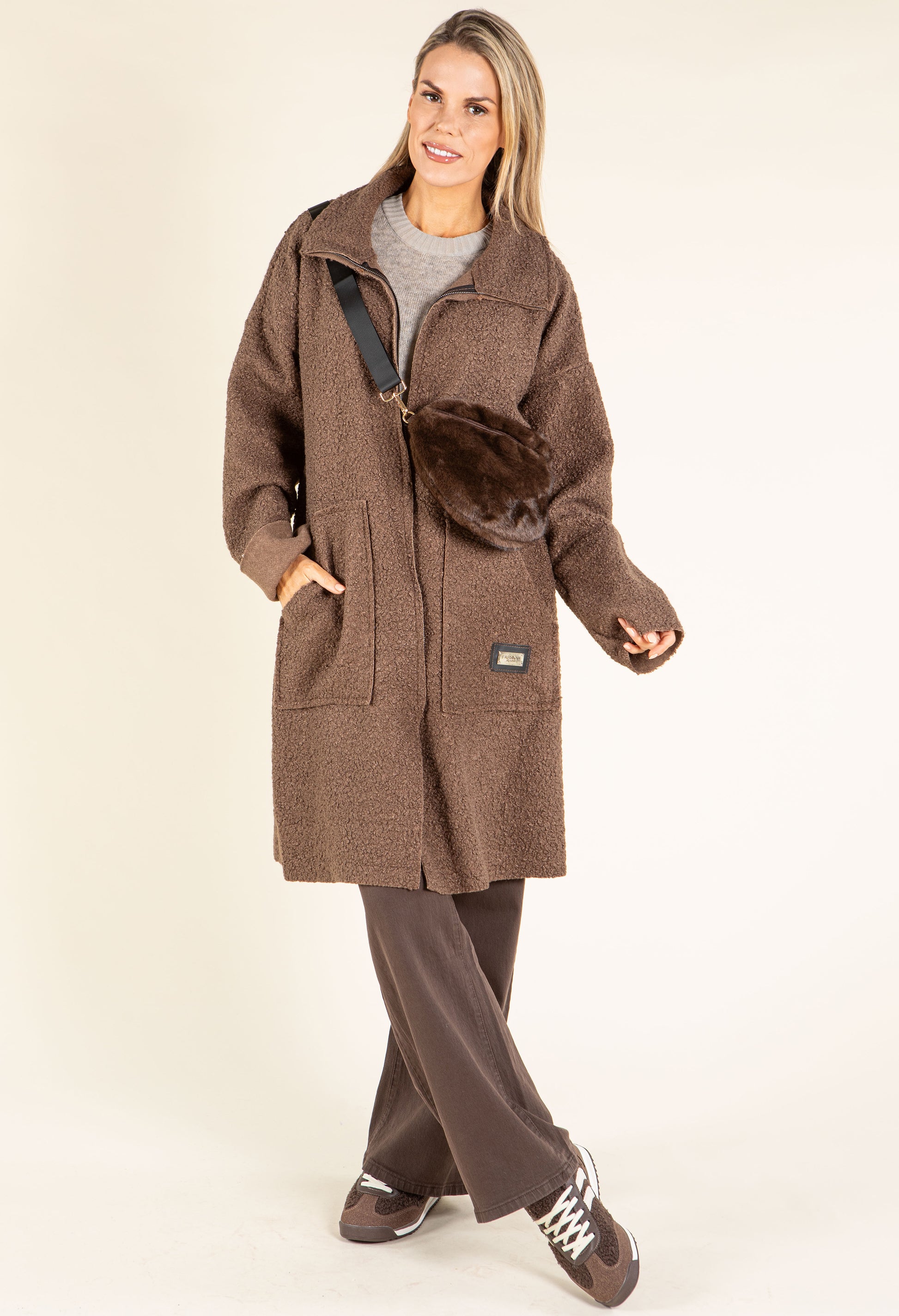 The Sophie Boucle Zip-up Coatigan features a convenient zip-up closure and front patch pockets for practicality. Designed with a collar and long sleeves, it’s crafted from soft boucle fabric that provides both comfort and style.