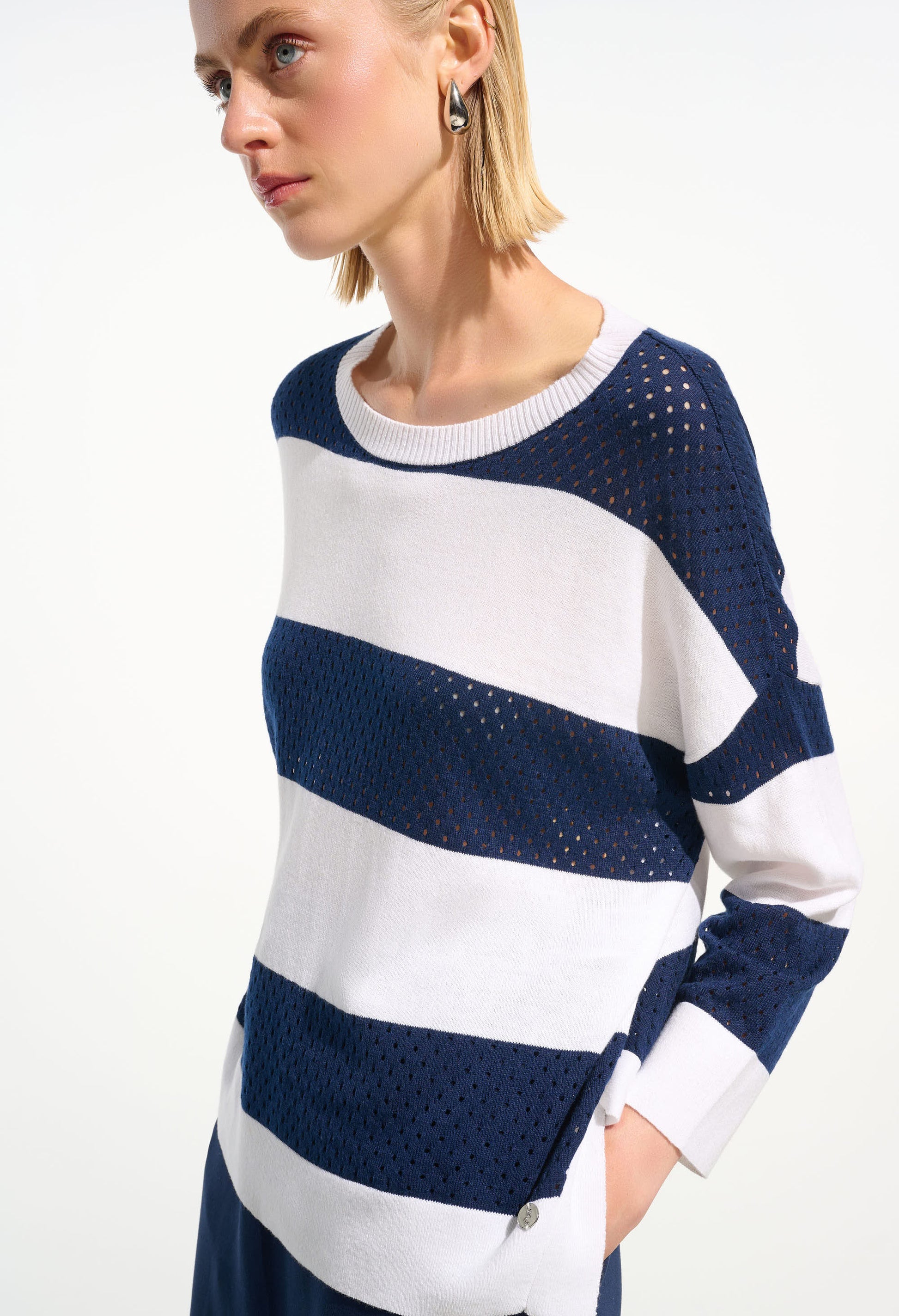 Experience the effortless elegance of the Joseph Ribkoff pullover. This chic hip-length piece features a crew neck and straight 3/4 sleeves, perfect for casual summer occasions. Its lightweight, knitted fabric with a stylish striped pattern ensures comfort and breathability, while the loose fit adds a relaxed yet sophisticated touch to your wardrobe.