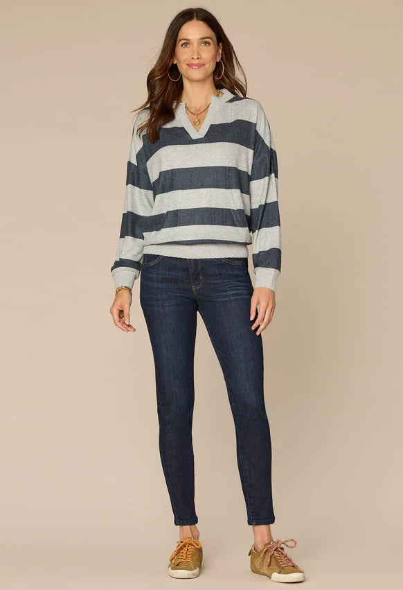Stripes are always in, and this knit top’s design details sweeten the deal. Featuring long raglan sleeves, a V-notch neck, kangaroo pocket, and scalloped rib contrast detailing, it’s a cozy style you’ll reach for on repeat.