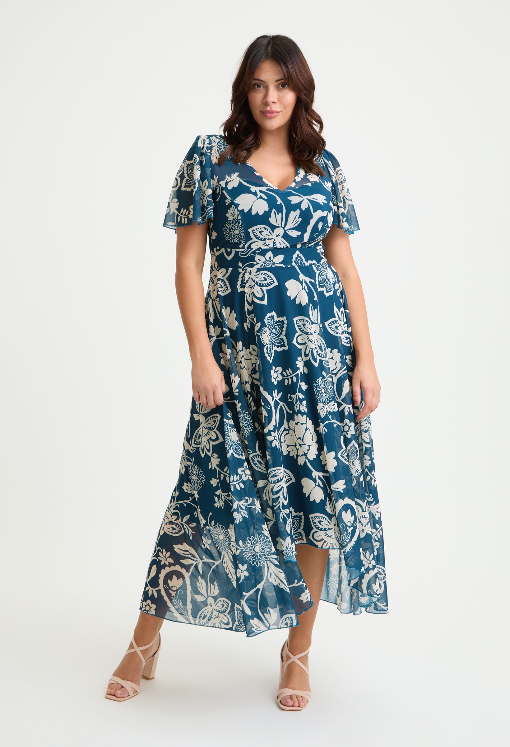 This stunning dress features a gorgeous floral print, a V-neckline, and a lined sweetheart detail. Made with our unique POWERFIT® stretch mesh, it exudes confidence while flattering your curves. The 1940s-inspired shoulder line and angel sleeves provide elegant coverage for your upper arms. Our signature MagicBand® creates a classic Scarlett and Jo silhouette, accentuating your curves and providing discreet support. The dress also boasts a beautiful draping skirt and a strikingly elegant Hi-Lo effect, making it the perfect choice for any social occasion, from weddings and proms to parties.