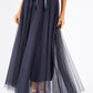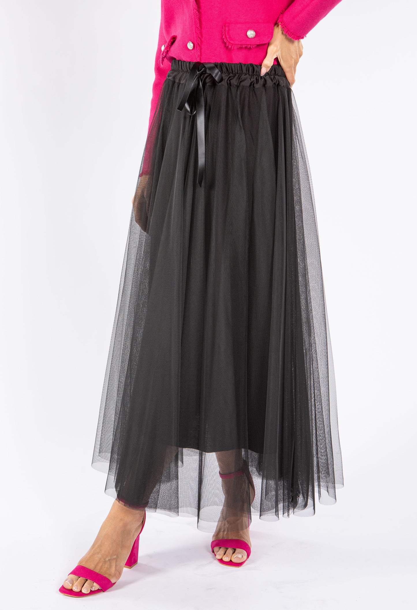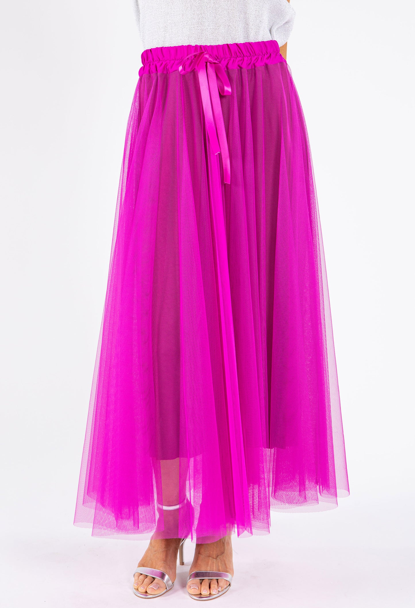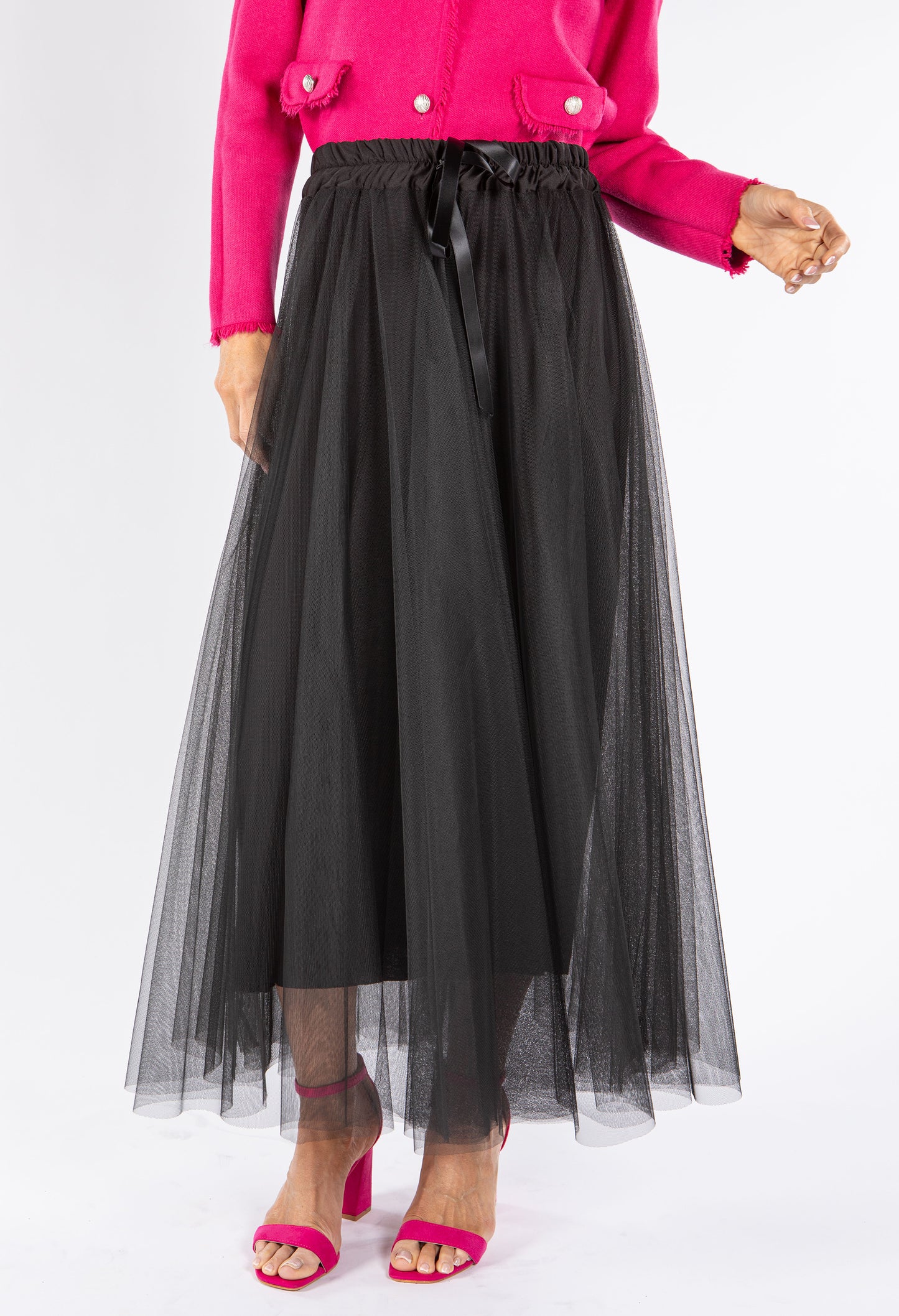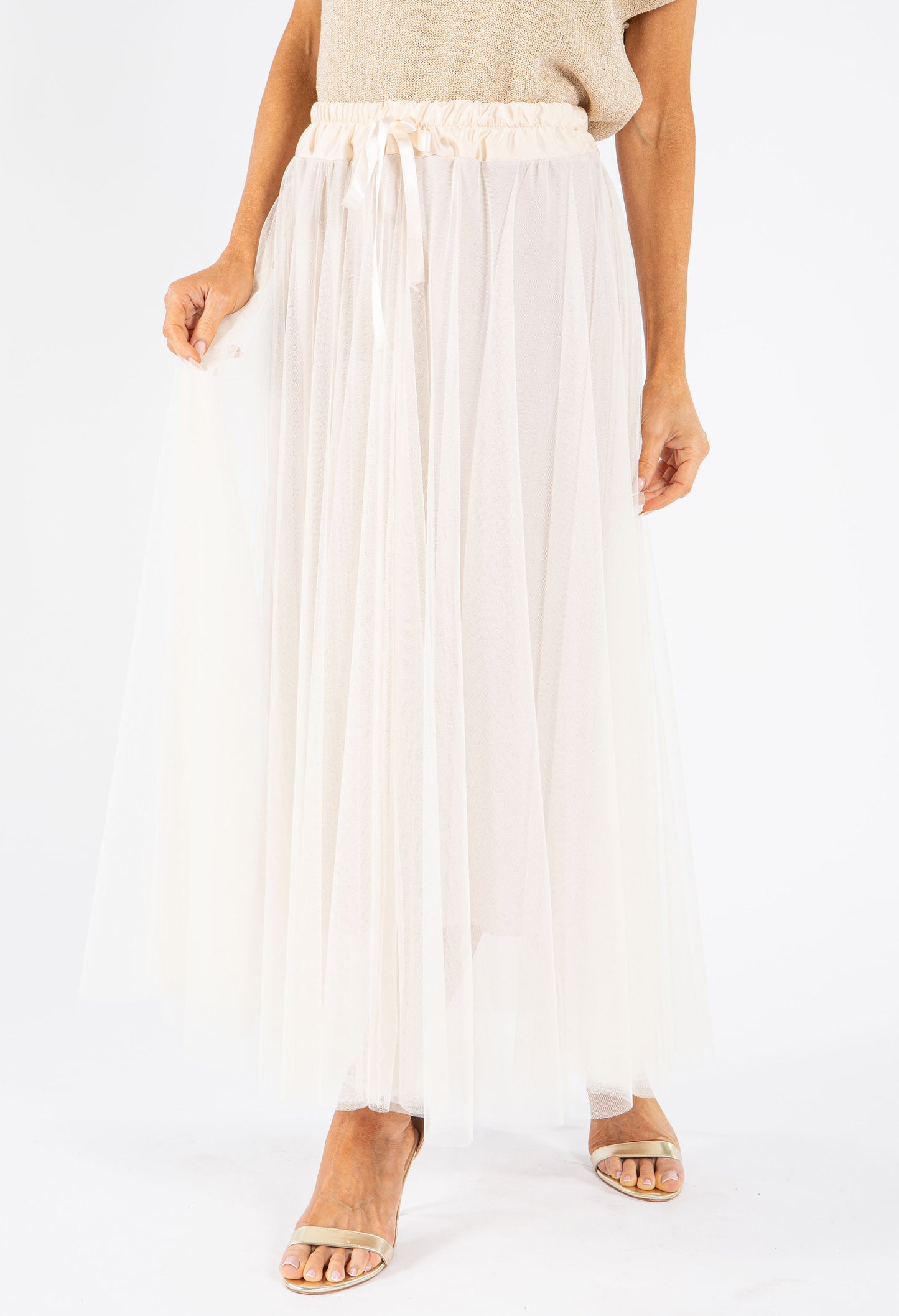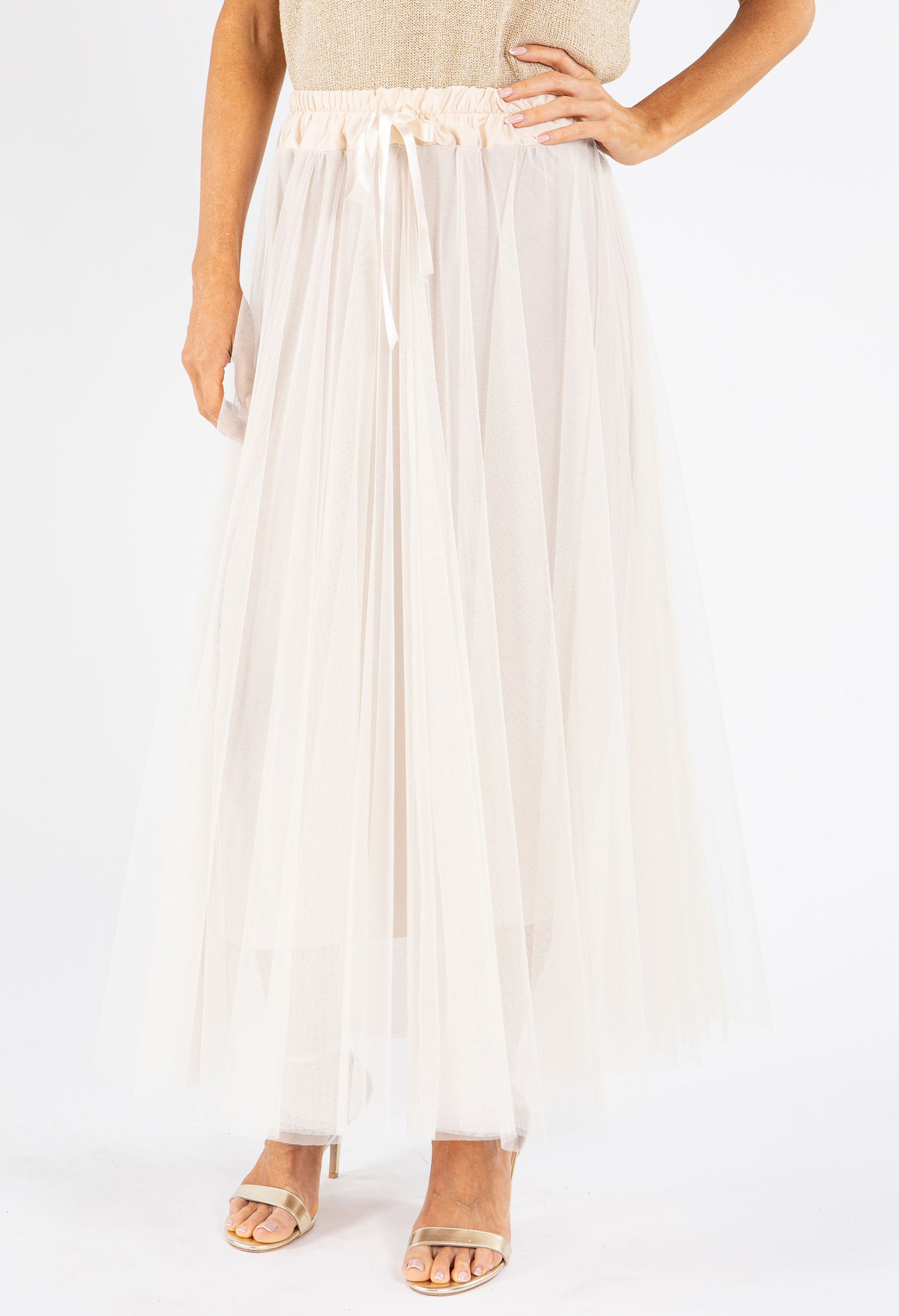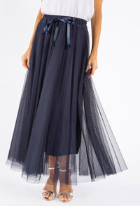 Elegant tulle skirt featuring a comfortable satin elasticated waistband with charming bow accent. Fully lined for comfort with a flowing tulle overlay. Versatile free size accommodates sizes 8-14.