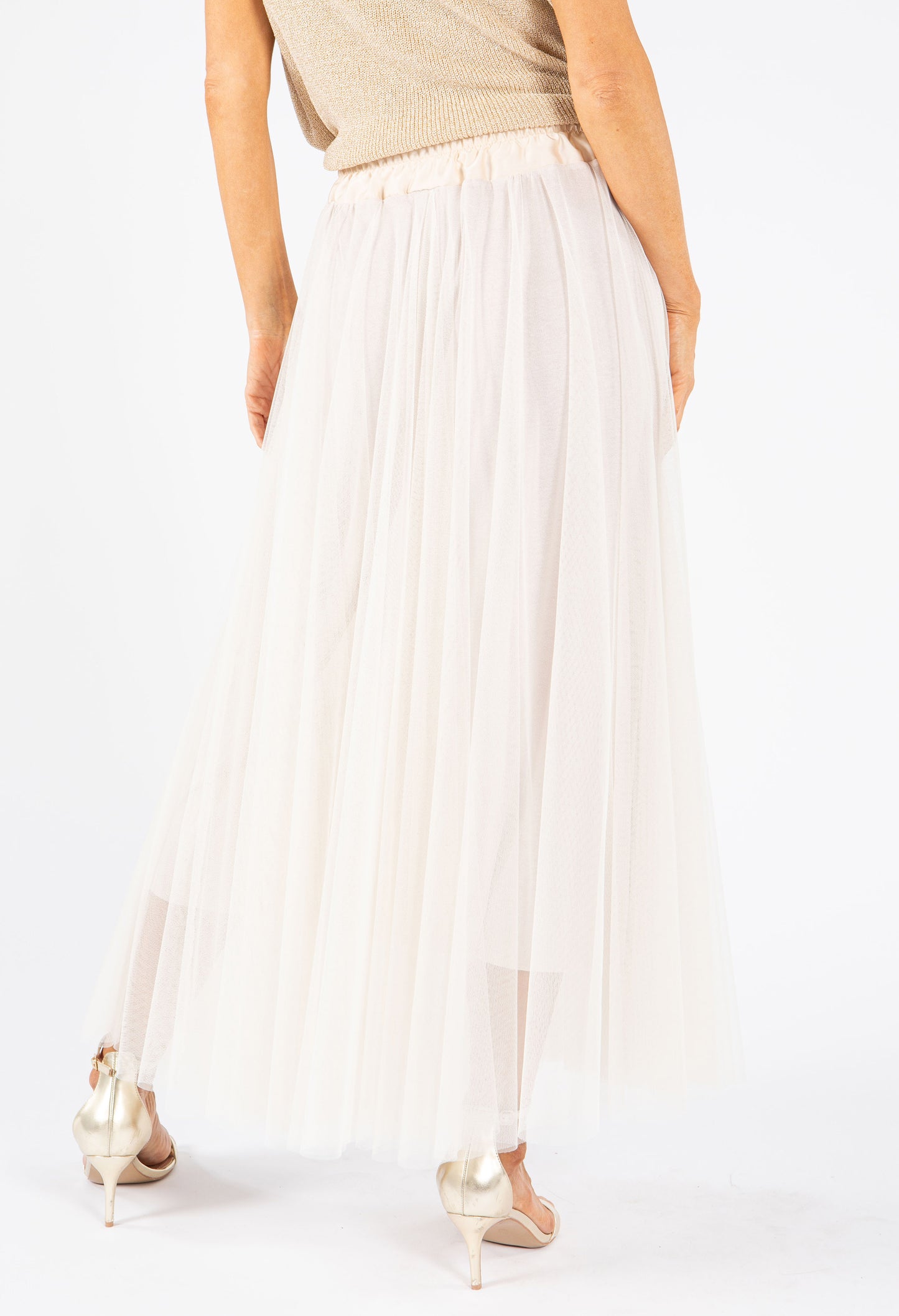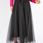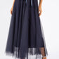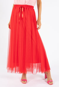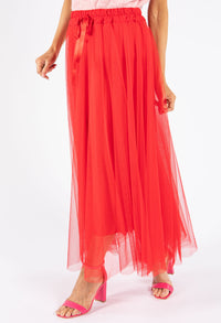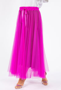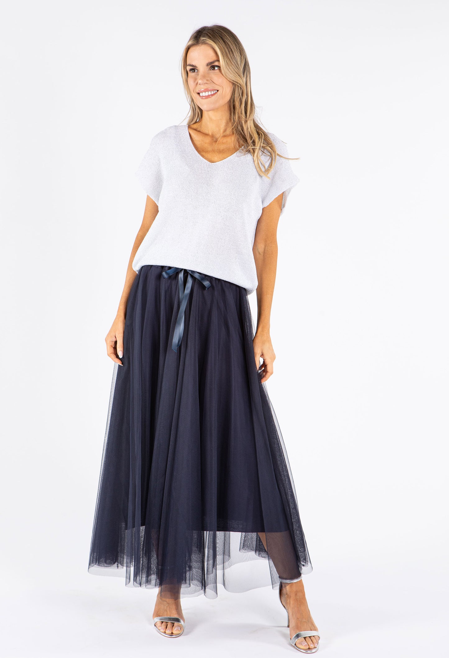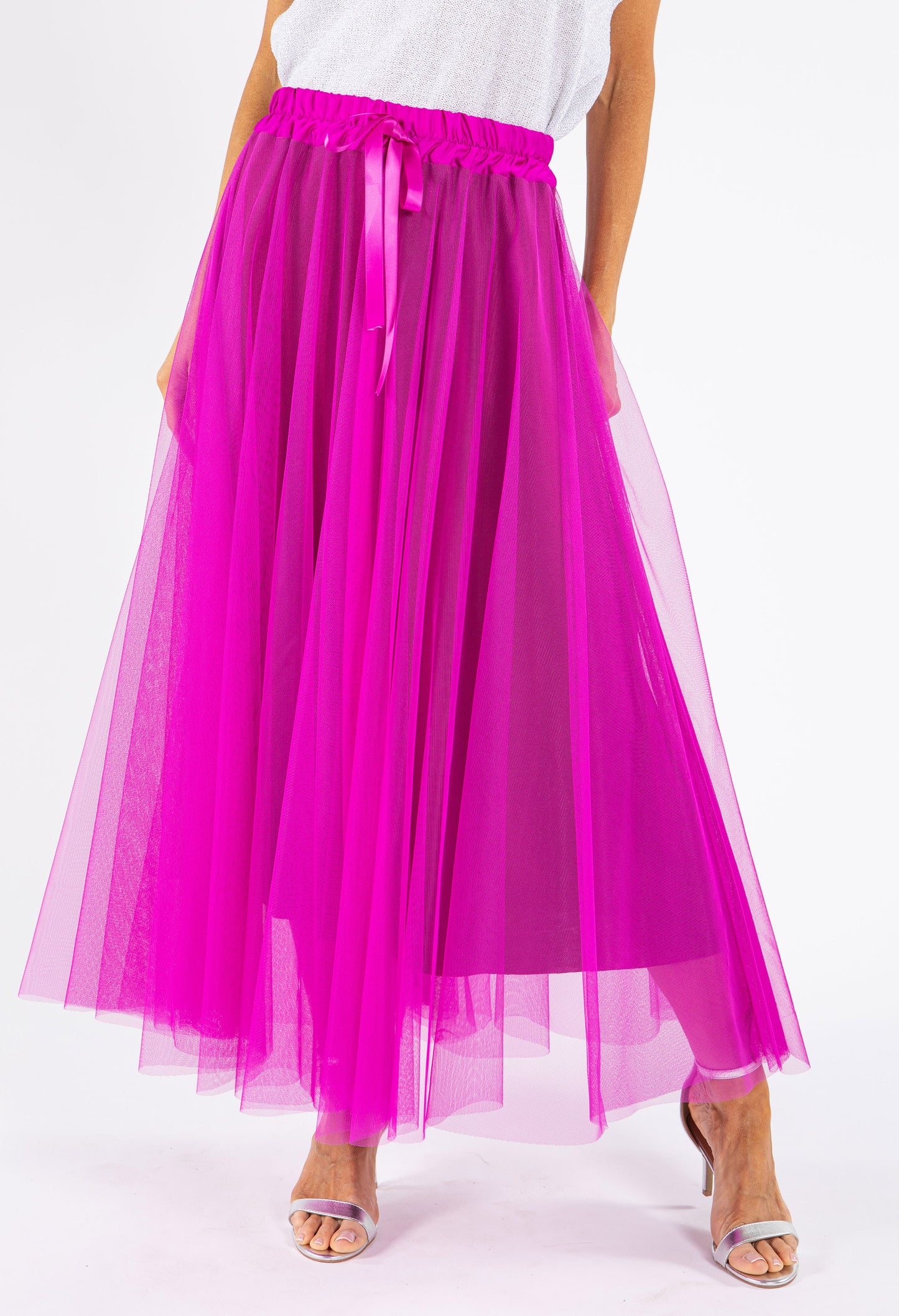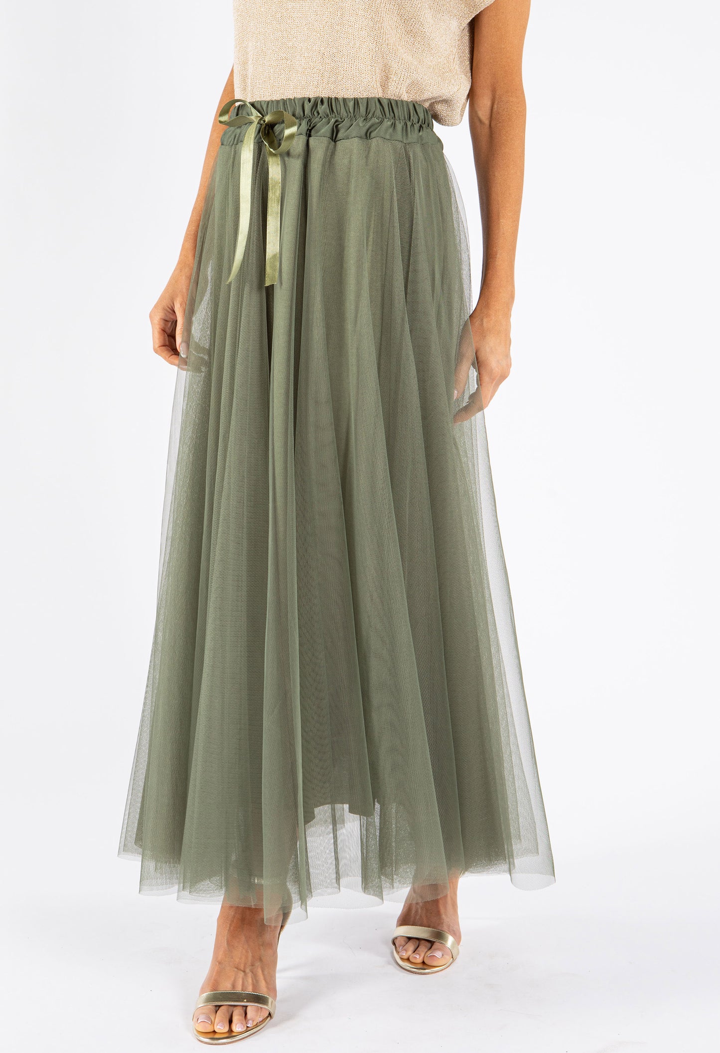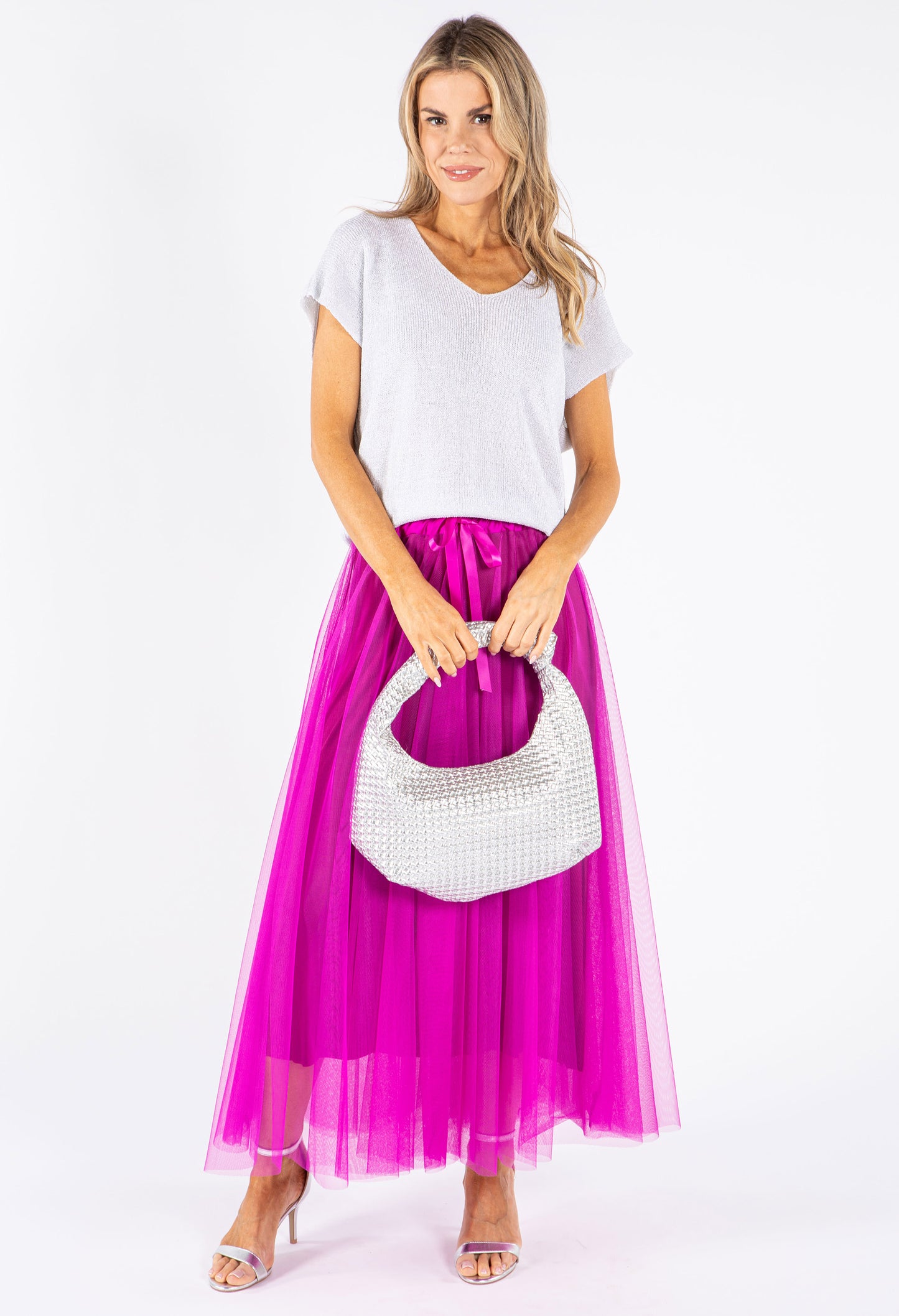 Elegant tulle skirt featuring a comfortable satin elasticated waistband with charming bow accent. Fully lined for comfort with a flowing tulle overlay. Versatile free size accommodates sizes 8-14.