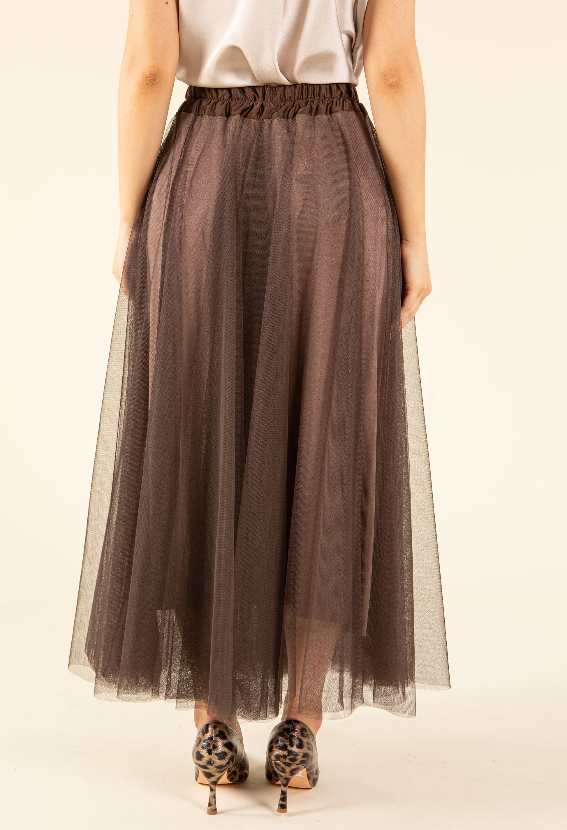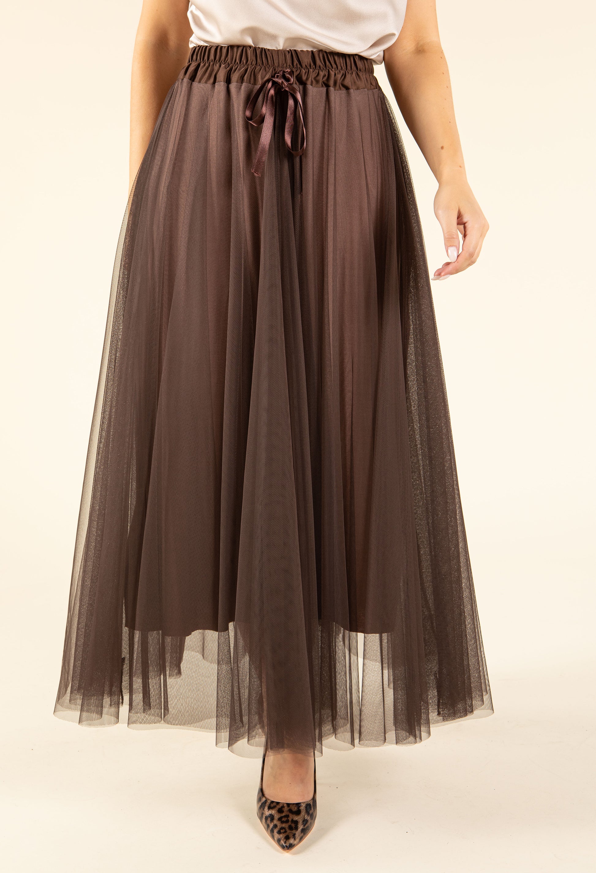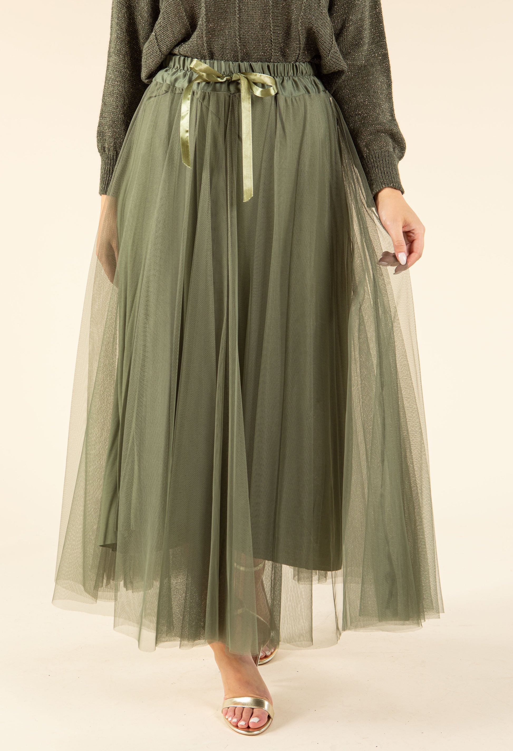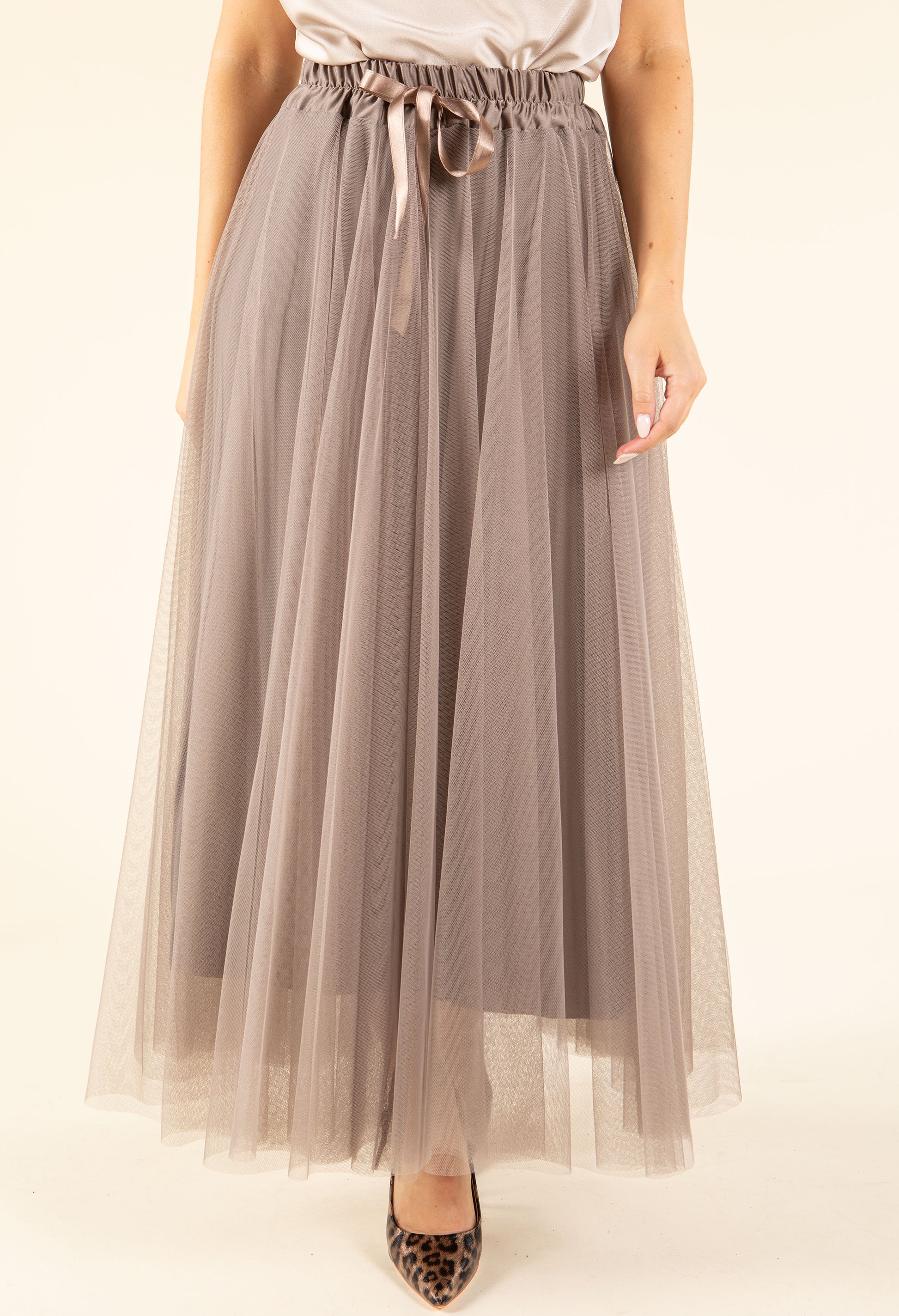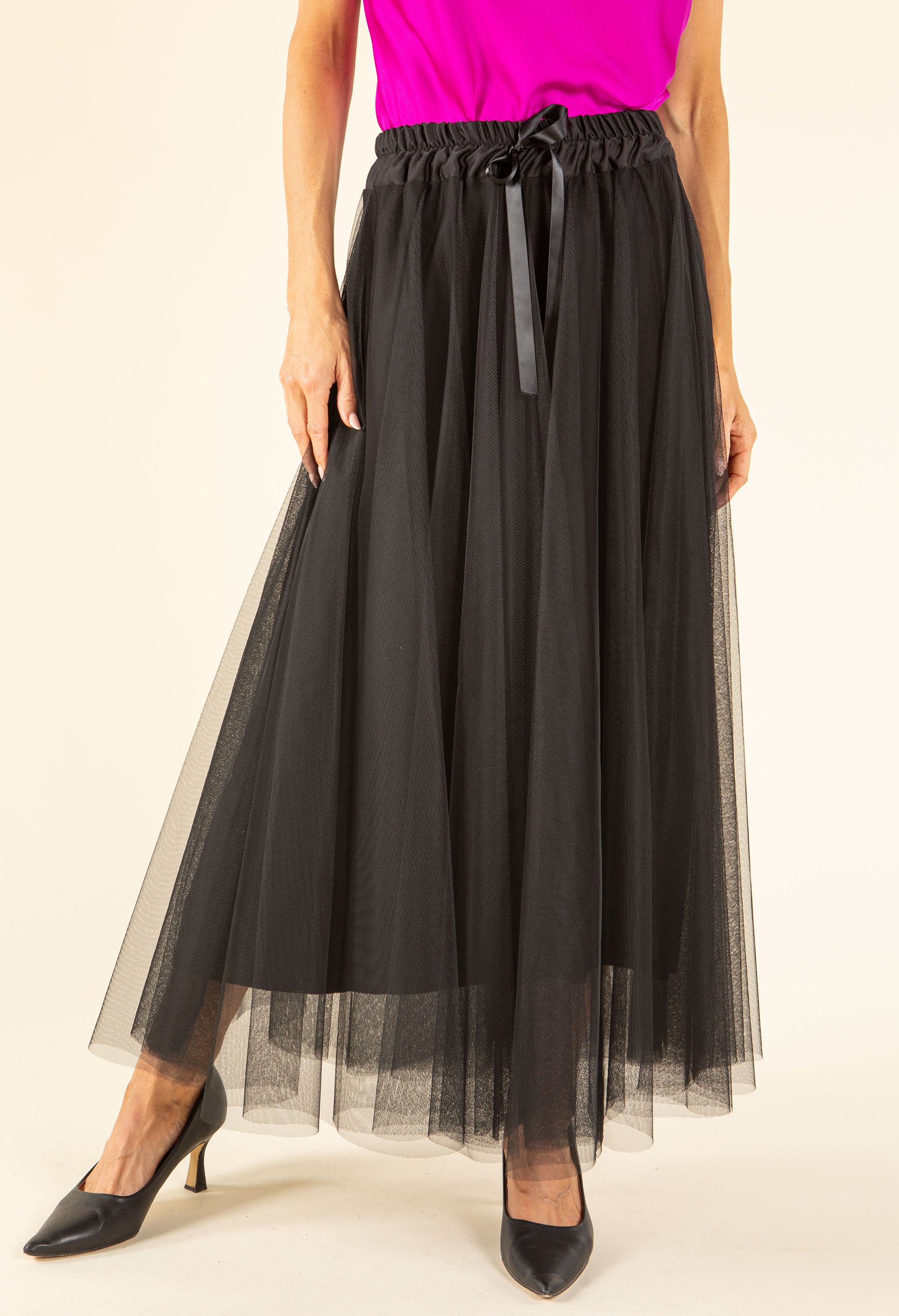 This refined midi skirt features a flowing tulle silhouette with a satin elasticated waistband and a delicate bow detail. Fully lined for comfort, it is designed as a free size to fit sizes 8 to 14 with ease.