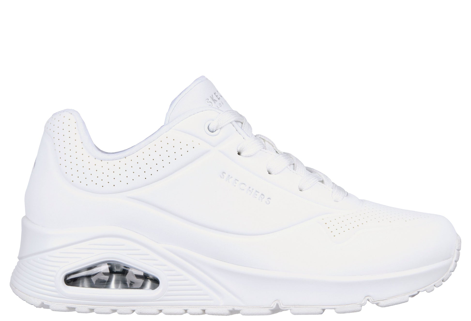 Classic air-cushioned comfort gets a fresh update in Skechers Street™ UNO - Stand on Air. This lace-up fashion style features a smooth perforated synthetic