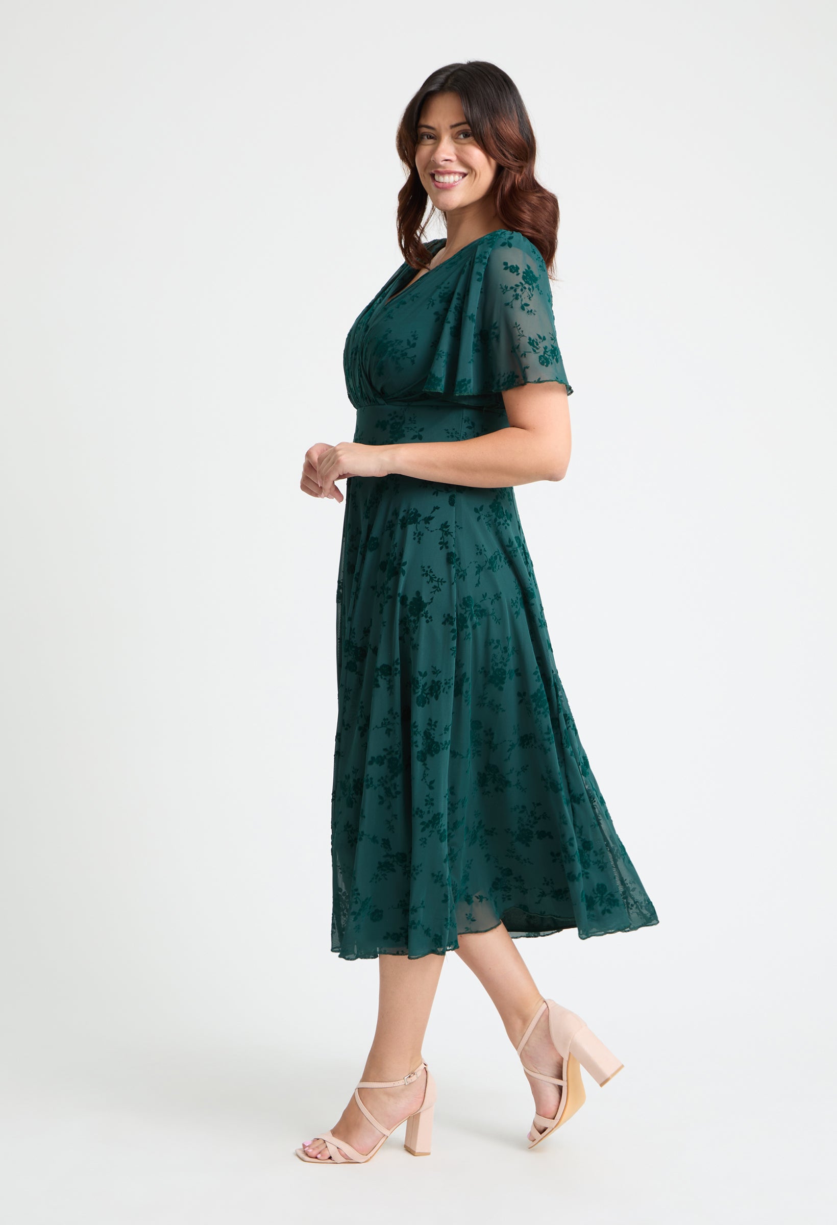 This Angel Sleeve Long Midi Dress is made in a super soft stretch POWERFIT® mesh featuring gorgeous green velvet ditsy flowers in a fabric that breathes. This dress comes with a MagicBand®, in-built corset to help accentuate curves and brings out that unique Scarlett and Jo hourglass shape. The secure deep V wrap-neck creates a flattering feminine silhouette and the angel sleeves provide upper arm coverage. The dress is fully lined and shoulder pads are detachable. This is a perfect dress that you can wear to any event.