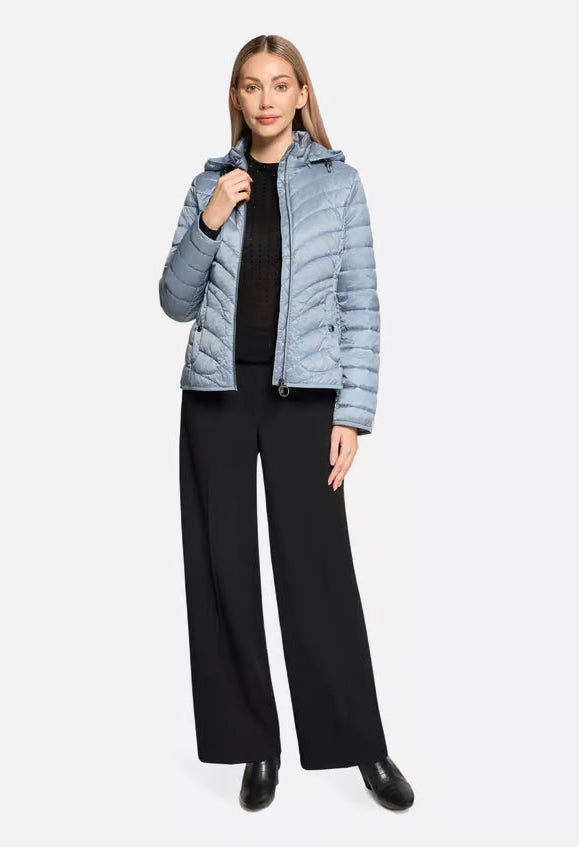 Casual meets trendy – this outdoor jacket lets you be both fashionable and functional. The slightly tailored fit and solid color give the jacket a modern elegance, while the quilted construction ensures comfortable wear. A stand-up collar and a two-way zipper offer versatile styling options. Practical details like an adjustable hem, removable panels, and additional zippers make this jacket the ideal companion for variable weather conditions.