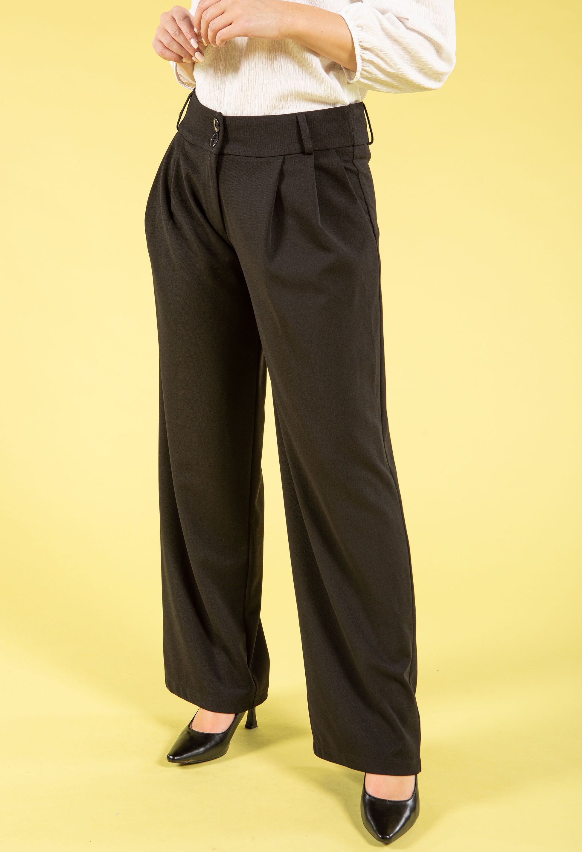 Step into timeless style with these wide leg city trousers, a wardrobe essential that flatters every frame. The high-waist cut creates a sleek silhouette, while the wide leg offers comfort and movement throughout your day. Practical side pockets keep essentials close, belt loops allow for customised styling, and the secure button and zip closure ensures a perfect fit. Crafted from stretch material, these trousers move with you effortlessly.
