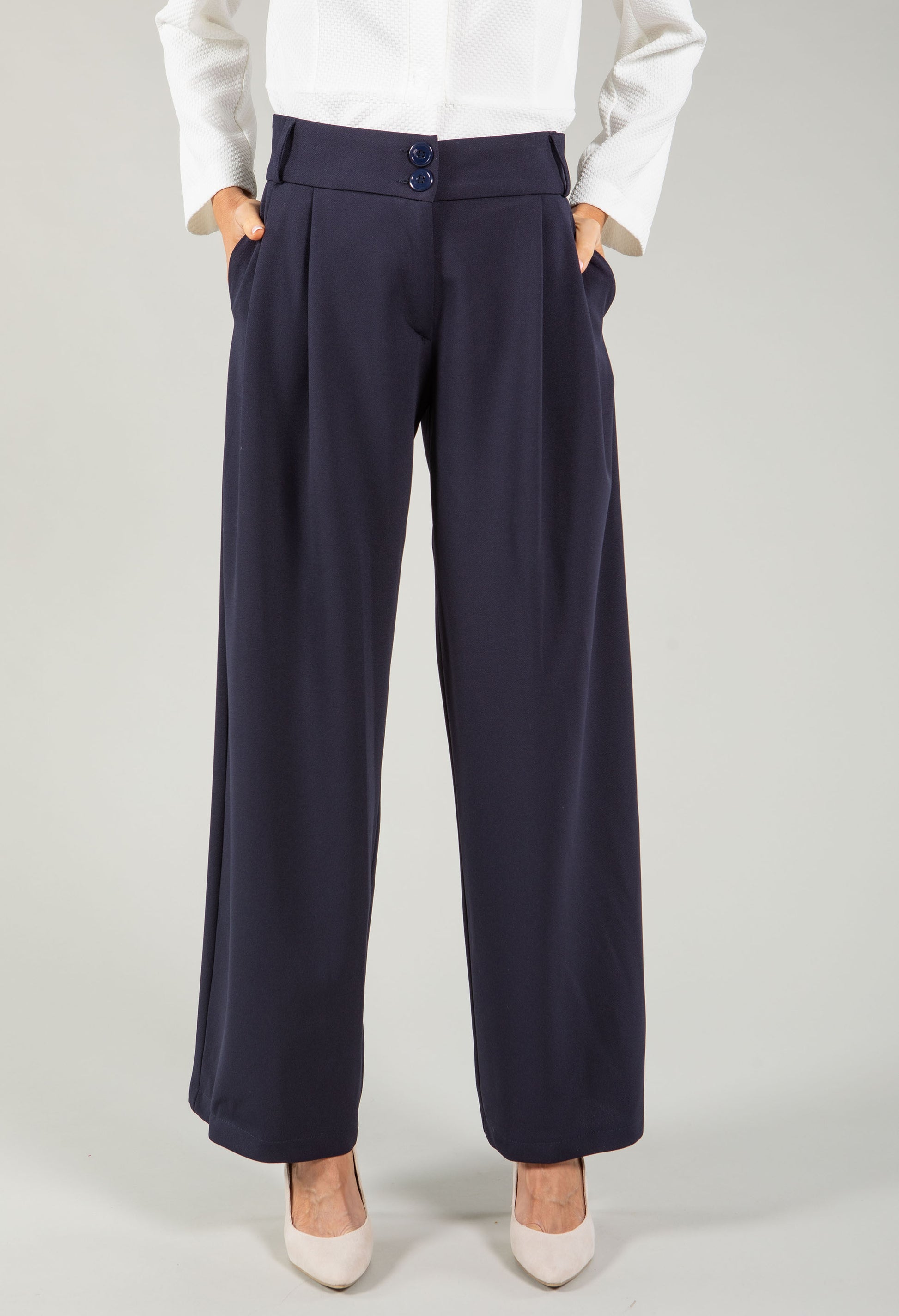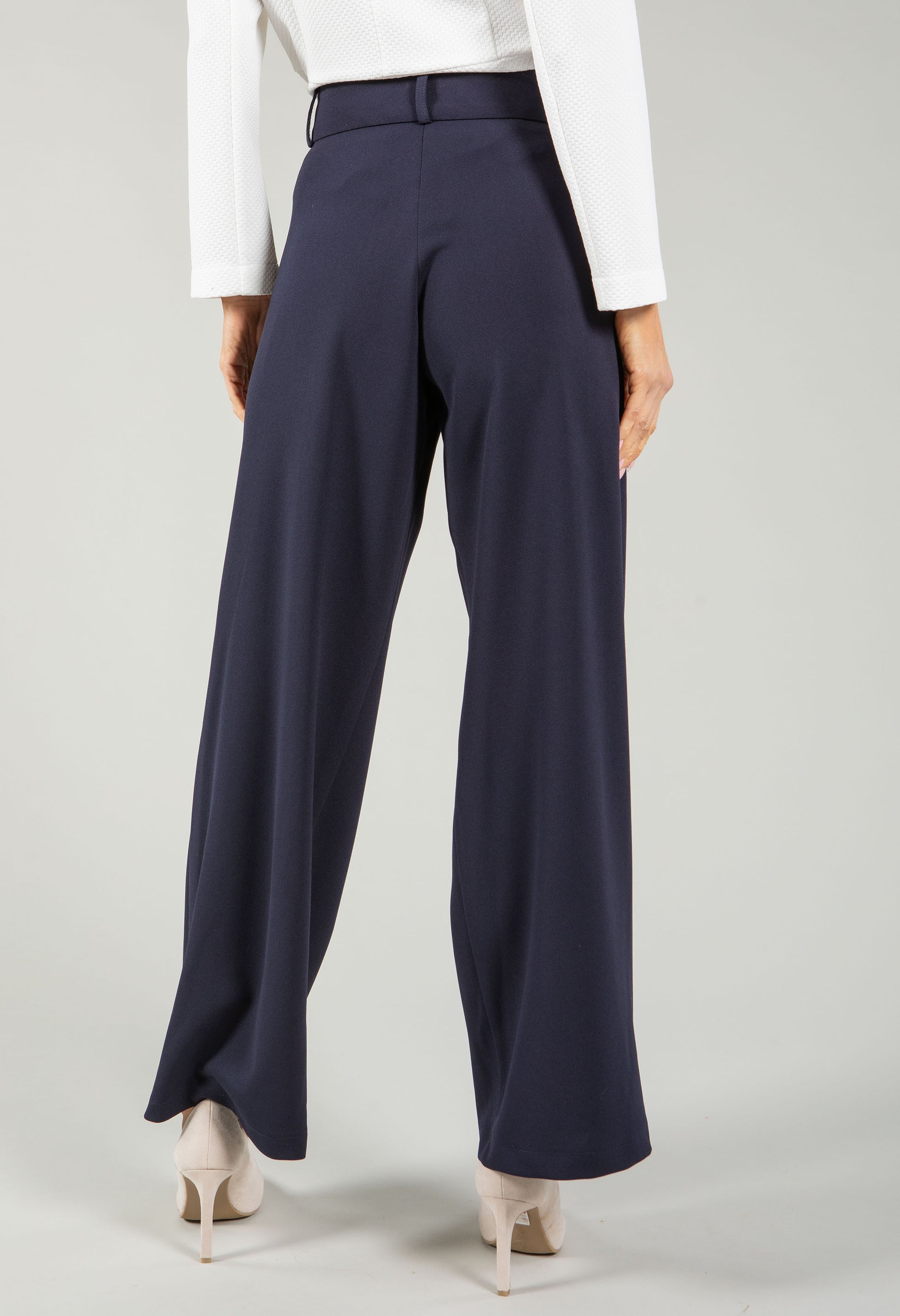 Step into timeless style with these wide leg city trousers, a wardrobe essential that flatters every frame. The high-waist cut creates a sleek silhouette, while the wide leg offers comfort and movement throughout your day. Practical side pockets keep essentials close, belt loops allow for customised styling, and the secure button and zip closure ensures a perfect fit. Crafted from stretch material, these trousers move with you effortlessly.