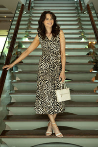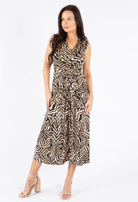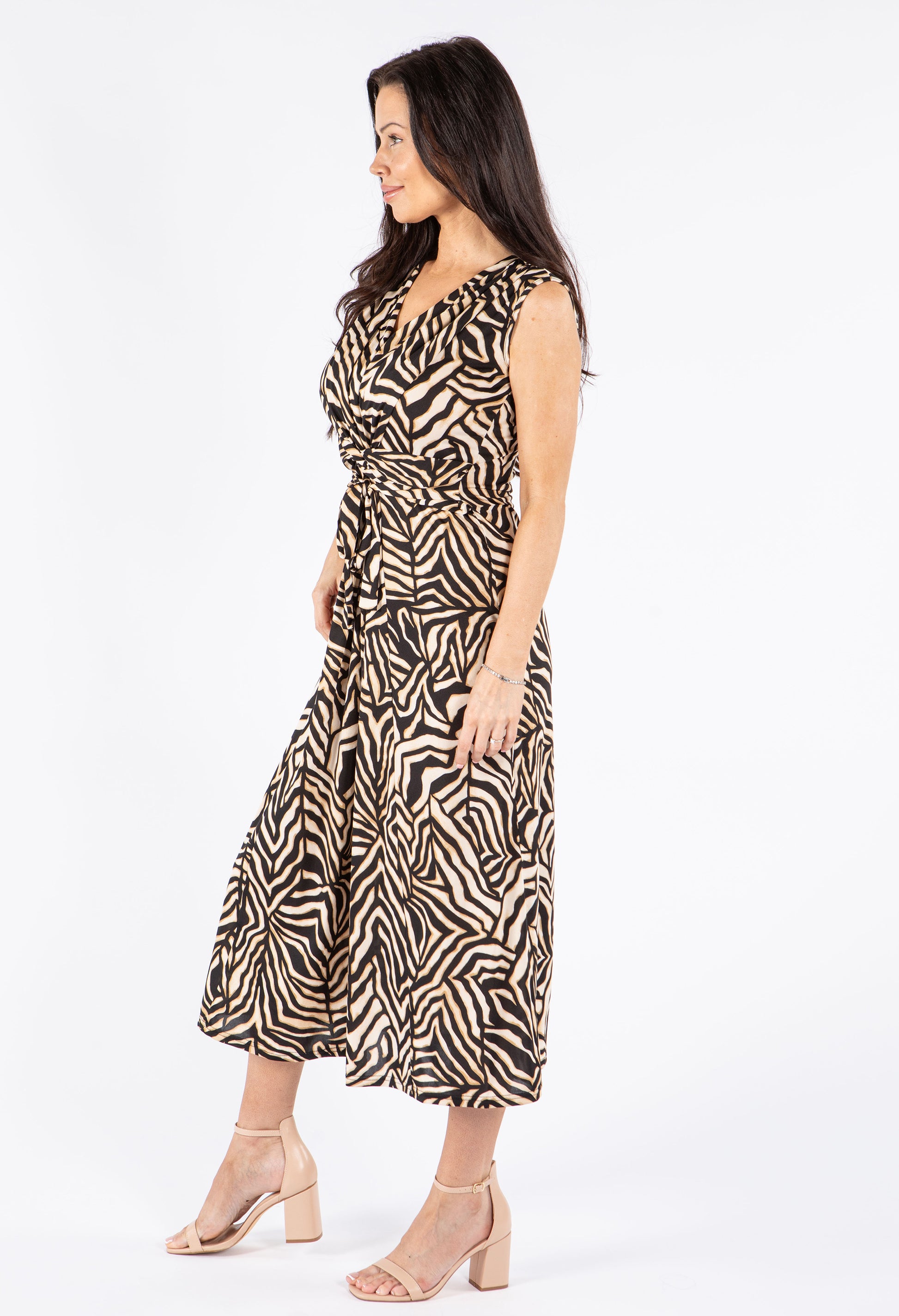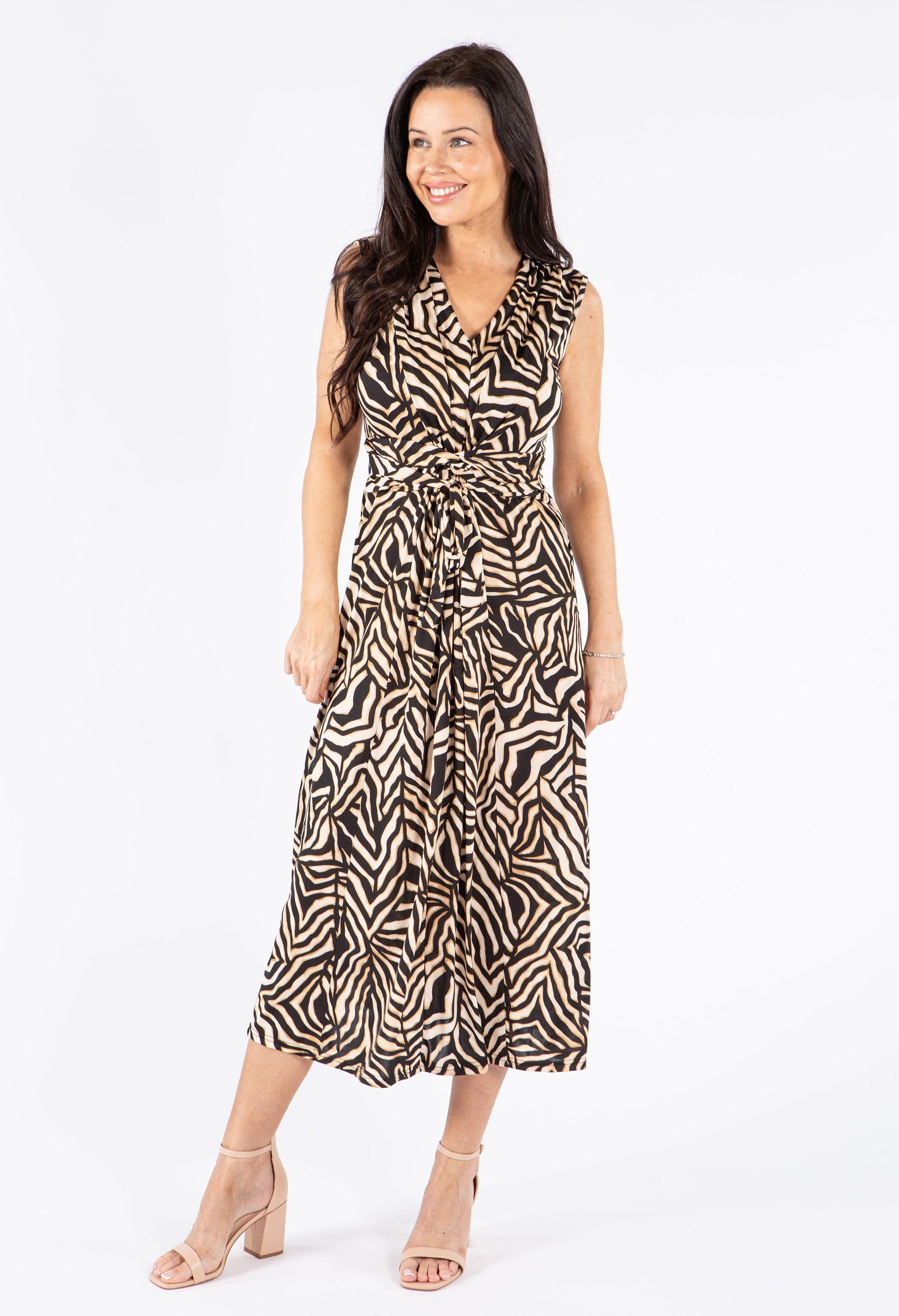 For a stylish look, opt for this V-Neckline Sleeveless Dress featuring a chic Zebra Print, complete with a Front Knot Detail and a Tie Waist Belt for a figure-flattering fit. Made with a Stretch material for optimum comfort.